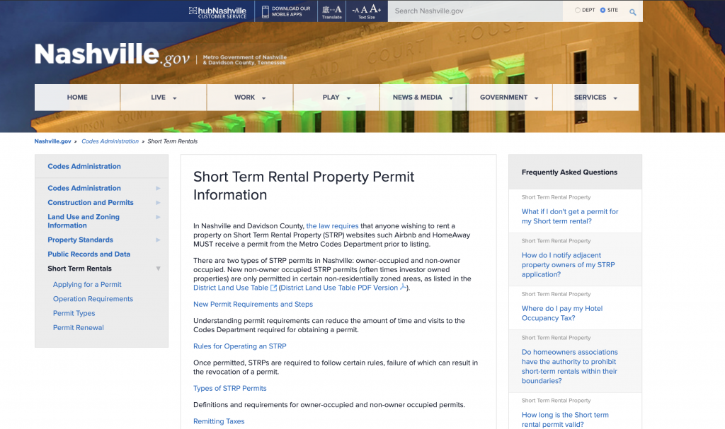 A crucial aspect of managing your Nashville Airbnb is making sure you’re in compliance with the city’s laws and permit rules. For more information, visit Nashville’s Metro government website. You’ll find answers to frequently asked questions and details about BL2017-608, the current law that governs short-term rental properties in Nashville and Davidson County as well as links to the ordinances that preceded it.